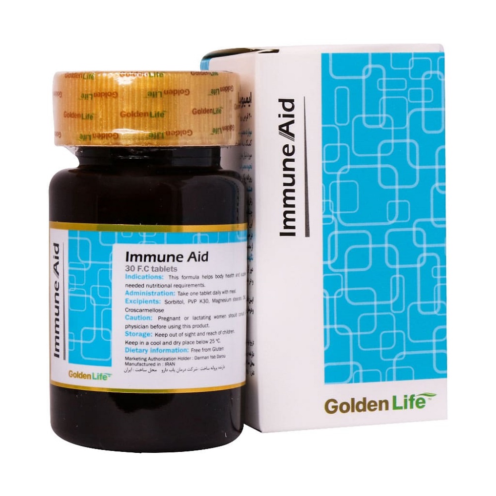ایمیون اید (سلامت عمومی بدن) گلدن لایف 30 قرص Immune Aid Golden Life 30tabs، دارای ویتامین C ،D3و گروه B، مواد معدنی زینک، سدیم، است. این فرآورده موجب بهبود عملکرد طبیعی بدن و سلامت عمومی آن می شود. ویتامین ها و مواد معدنی موجود در این فرآورده سیستم ایمنی را تقویت کرده و با توجه به آنتی اکسیدان بودن آن، بدن را در برابر آسیب ها از جمله رادیکال های آزاد مصون نگه می دارد.